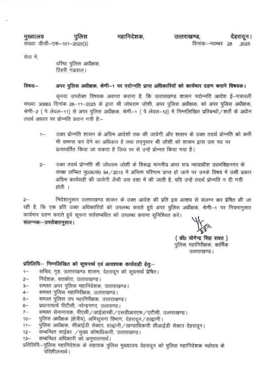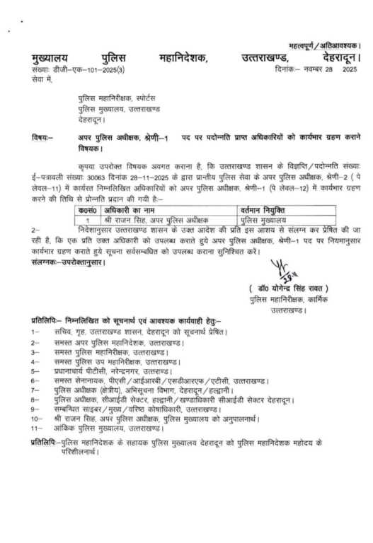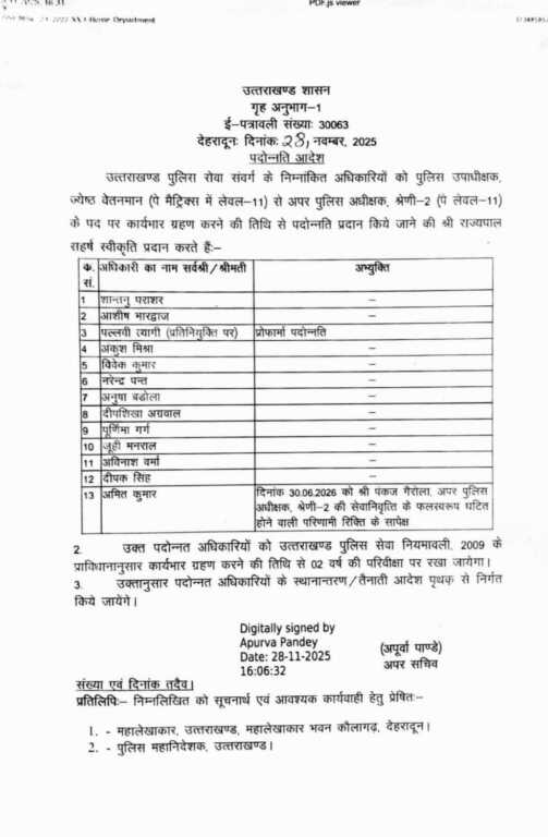 देहरादून। उत्तराखंड पुलिस महकमे में बड़ा प्रशासनिक फेरबदल किया गया है। विभाग ने आधा दर्जन से अधिक पुलिस क्षेत्राधिकारियों (CO) को नई और महत्वपूर्ण जिम्मेदारियाँ सौंपी हैं। प्रमोद शाह, शांतनु पाराशर सहित कई अधिकारियों को अपर पुलिस अधीक्षक (Additional SP) के पद पर तैनाती मिली है।