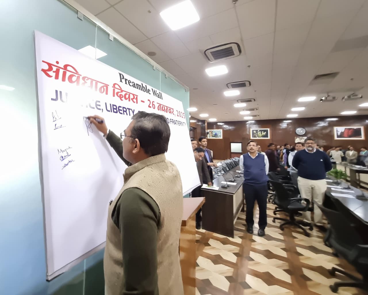 मुख्य सचिव आनन्द बर्द्धन ने बुधवार को सचिवालय में संविधान दिवस के अवसर पर अधिकारियों एवं कर्मचारियों के साथ भारत का संविधान की प्रस्तावना का पाठ किया। इस अवसर पर सभी ने प्रस्तावना पट पर हस्ताक्षर भी किए।