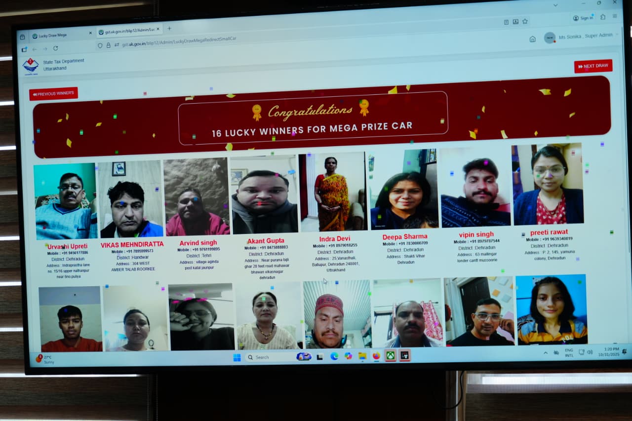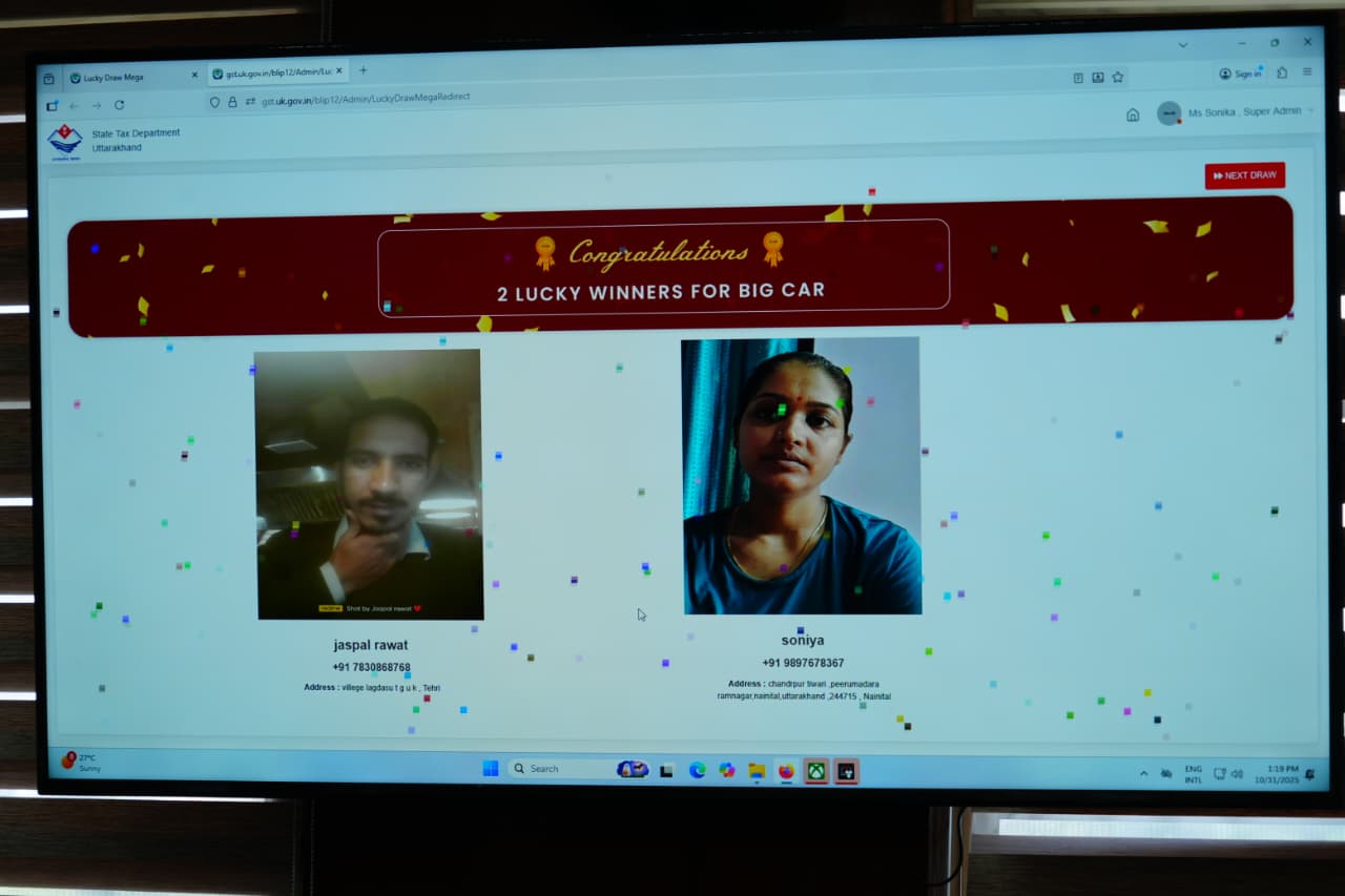 मुख्यमंत्री पुष्कर सिंह धामी ने शुक्रवार को सचिवालय में ‘बिल लाओ, ईनाम पाओ’ के अंतर्गत मेगा लकी ड्रॉ का शुभारंभ किया। राज्य कर विभाग, उत्तराखंड द्वारा आयोजित इस कार्यक्रम में कुल 1888 लकी ड्रॉ विजेता चुने गए। नैनीताल जनपद की सोनिया और टिहरी जनपद के जसपाल रावत ने प्रथम विजेता के रूप में एक-एक इलेक्ट्रिक कार जीती। मुख्यमंत्री ने दोनों विजेताओं से फोन पर बात कर उन्हें शुभकामनाएं भी दीं। मुख्यमंत्री ने कहा कि ‘बिल लाओ, ईनाम पाओ’ योजना राज्य में जारी रहेगी।