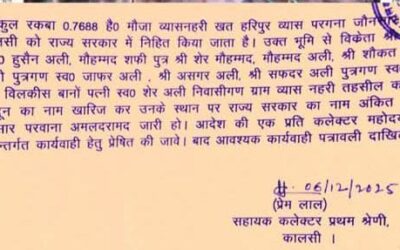 देहरादून के कालसी क्षेत्र के हरिपुर व्यास स्थित जिस जमीन पर पाकिस्तान/पीओके के व्यक्ति ने अपना दावा जताया था, वह जमीन अब सरकार के नाम चढ़ा दी गई है। उपजिलाधिकारी कालसी प्रेमलाल ने जमीन पर दर्ज आठ व्यक्तियों के नाम काट दिए और इसके साथ ही 0.7688 हेक्टेयर भूमि सरकार में निहित कर दी गई।…