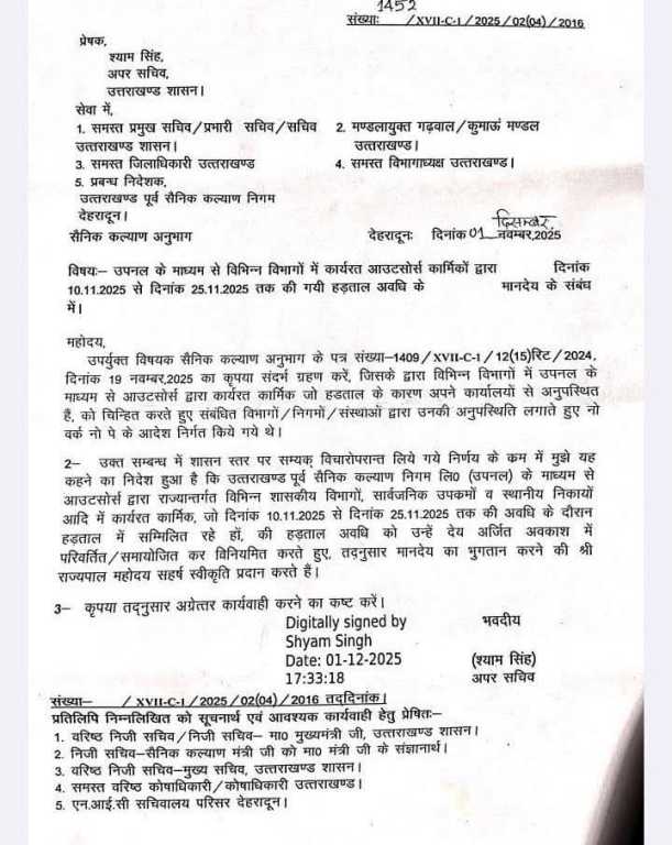अपर सचिव श्याम सिंह ने जारी आदेश में कहा कि उत्तराखंड पूर्व सैनिक कल्याण निगम के माध्यम से विभिन्न विभागों में कार्यरत कर्मचारी जो 10 नवंबर 2025 से 25 नवंबर 2025 तक हड़ताल पर रहे। उनकी हड़ताल की अवधि को अर्जित अवकाश में बदलते हुए उन्हें मानदेय का भुगतान किया जाएगा।